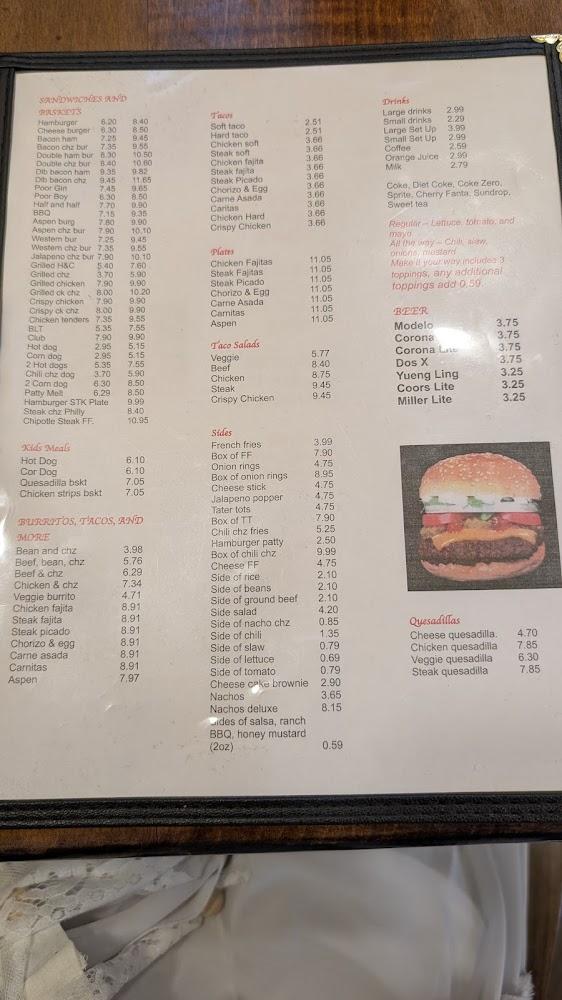 Aspen Grill features a diverse menu that appeals to various tastes. The burgers shine with options like the classic cheeseburger and unique combinations. For lighter fare, taco salads and burritos deliver bold flavors. Breakfast delights offer options from huevos rancheros to breakfast burritos. Diners can also indulge in hearty sides such as nachos and fries. Seasonal specialties may surprise regulars while maintaining comfort staples. With many dishes priced reasonably, options abound for quick meals or leisurely dining.